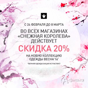 В магазине «Снежная Королева» в Белгороде с 24 февраля по 8 марта 2016 г. действует скидка 20% на новую весеннюю коллекцию для женщин и мужчин!