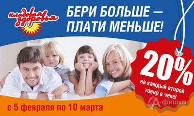 В сети ортопедических салонов «Кладовая здоровья» до 10 марта 2016 г. проходит акция «Бери больше – плати меньше!» – на каждый второй товар в чеке скидка 20%!