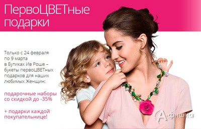 Только с 24 февраля по 9 марта 2016 г. в бутиках косметики «Ив Роше» проходит акция «ПервоЦВЕТные подарки» – подарочные наборы со скидкой до 35% и подарки каждой покупательнице!