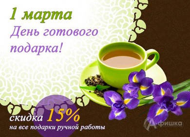 В сети магазинов «Чайная Пагода» в Белгороде 1 марта 2016 г. объявлен Днём готового подарка! На все подарки для женщин ручной работы из чая и кофе скидка 15%!
