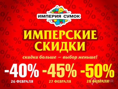 Только 3 дня в магазинах сети «Империя сумок» в Белгороде проходит большая распродажа «Имперские скидки» – модные сумки и аксессуары из коллекции «Осень-Зима 2015-2016 года» со скидками до 50%!