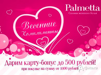 В фирменных салонах женского белья «Palmetta» с 26 февраля по 13 марта 2016 г. проходит акция «Весенние комплименты» – при покупке на сумму от 1000 руб. получите карту-бонус «Комплимент» в подарок!