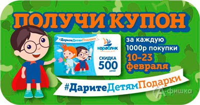 С 10 по 23 февраля 2016 г. «Дарите детям подарки» – за каждую потраченную 1000 руб. в детских магазинах «Кораблик» получите купон на 500 руб.!