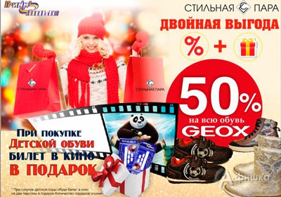 В магазине обуви «Стильная пара» в Белгороде «Двойная выгода» – скидка 50% на всю обувь Geox, а также при покупке детской обуви билет в кино* в подарок!
