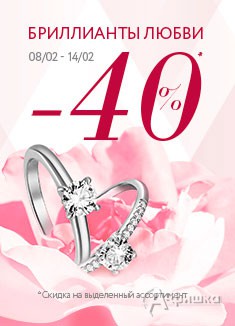 Только до 14 февраля 2016 г. в магазине «Московского ювелирного завода» проходит акция «Бриллианты любви»! Скидка 40% на украшения с бриллиантами из выделенного ассортимента!