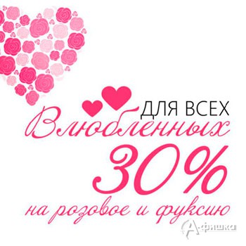 В магазинах одежды «Zarina» в Белгороде с 9 по 15 февраля 2016 г. для всех влюблённых действует романтическая скидка 30% на все модели розового цвета и цвета фуксии.
