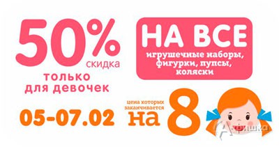 С 5 по 7 февраля 2016 г. в детских магазинах «Кораблик» на игрушки для девочек (игрушечные наборы, фигурки, пупсы, коляски для кукол), цена которых заканчивается на 8, действует скидка 50%!