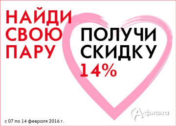 В магазине «Фабрика обуви» до 14 февраля 2016 г. проходит акция «Найди свою пару» – из выделенного ассортимента обуви выберите мужскую и женскую пары и получите скидку 14% на обе покупки!