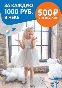 В магазинах «Детский мир» с 14 по 31 декабря 2015 г. проходит акция – при единовременной покупке за каждую 1000 руб. в чеке 500 руб. в подарок!