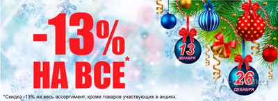 13 и 26 декабря 2015 г. в сети магазинов косметики и бытовой химии «Идея» действует скидка 13% на весь ассортимент!