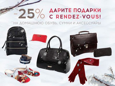 В магазине обуви и аксессуаров «Рандеву» в Белгороде проходит акция «Дарите подарки с Rendez-vous» – до 31 декабря 2015 г. скидка 25% на домашнюю обувь, сумки и аксессуары!
