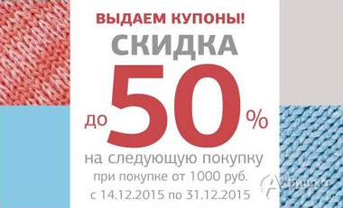 В магазинах обуви и аксессуаров «ЦентрОбувь» в Белгороде с 14 по 31 декабря 2015 г. при покупке от 1000 руб. получите купон на скидку до 50% на следующую покупку!