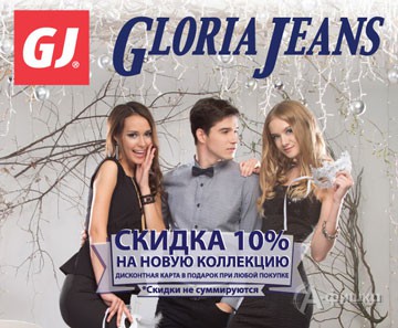 В сети магазинов одежды «Gloria Jeans» в Белгороде действует скидка 10% на новую коллекцию! Дисконтная карта в подарок при любой покупке.
