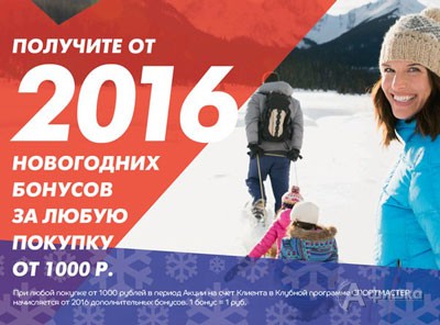 В сети магазинов спортивных товаров «Спортмастер» до 31 декабря 2015 г. проходит акция – совершите любую покупку на сумму свыше 1000 руб. и получите 2016 дополнительных бонусных балов на свою клубную карту!