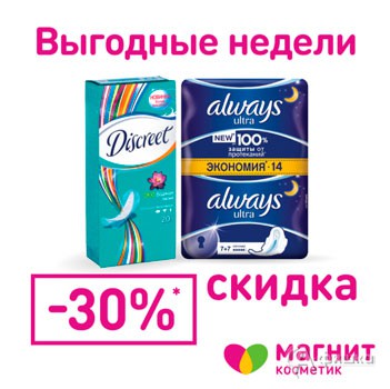 В сети магазинов «Магнит Косметик» проходит акция «Выгодные недели». С 25 по 31 октября 2015 г.скидка 30% на средства женской гигиены!