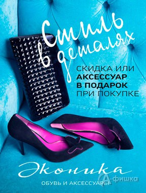 В салоне женской обувной сети «Эконика» в Белгороде до 1 ноября 2015 г. проходит акция «Стиль в деталях» – при покупке на сумму чека от 10000 руб. получите стильный аксессуар в подарок или скидку 30% на выделенный ассортимент сумок и кожгалантереи!