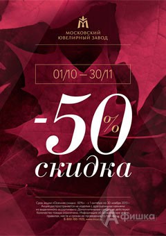С 1 октября по 30 ноября 2015 г. в магазине «Московского ювелирного завода» проходит акция «Осенняя скидка»! При покупке изделий из золота, платины со вставками из драгоценных камней из специального ассортимента предоставляется скидка 50% от стоимости изделия!