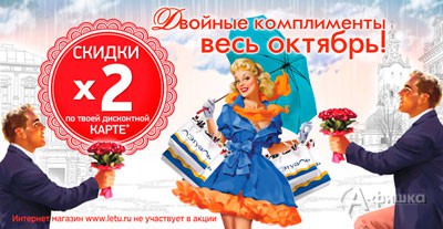 Весь октябрь 2015 г. в сети магазинов парфюмерии и косметики «Л’Этуаль» снова проходит акция «Двойные комплименты»: сумма скидки по дисконтной карте клиента удваивается и выдается в виде бонуса!