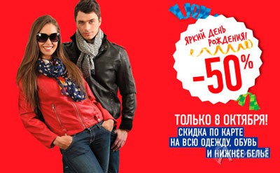 Только 8 октября 2015 г. в гипермаркетах «Лента» в Белгороде проходит акция – скидка 50% на всю одежду, обувь и нижнее бельё (в том числе детские) по карте «Лента»!