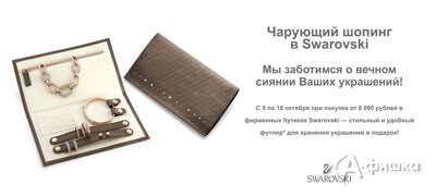 В фирменном бутике «Swarovski» до 18 октября 2015 г. проходит акция «Чарующий шопинг» – при покупке от 8990 руб. стильный и удобный футляр для хранения украшений в подарок!