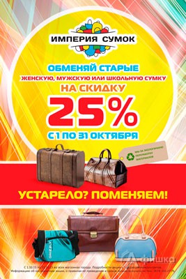 С 1 по 31 октября 2015 г. в магазинах «Империя сумок» в Белгороде проходит акция «Утилизация»! Принесите старую женскую, мужскую или школьную сумку и получите скидку 25%!