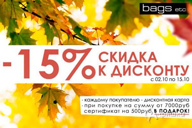 В магазине аксессуаров «Bags etc» в Белгороде до 15 октября 2015 г. действует осенняя акция – каждый покупатель с дисконтной картой получает дополнительно 15% скидки!