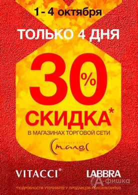 В салонах обуви и аксессуаров «Vitacci» и в магазине сумок и аксессуаров «Labbra» в Белгороде только с 1 по 4 октября 2015 г. действует скидка 30% на всё!