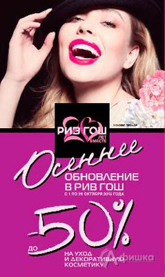 С 1 по 31 октября 2015 г. в магазине парфюмерии и косметики «Рив Гош» проходит акция «Осеннее обновление» – скидки до 50% на уход и декоративную косметику!