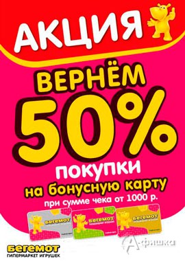 В гипермаркетах игрушек «Бегемот» с 1 по 11 октября 2015 г. проходит акция – при суме чека от 1000 руб. 50% покупки возвращается на бонусную карту!