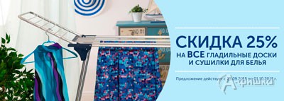 В гипермаркете домашних товаров «Уютерра» с 25 сентября по 1 октября 2015 г. скидка 25% на все гладильные доски и сушилки для белья.