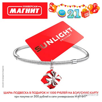 До 6 октября 2015 г. в универсамах «Магнит» проходит акция «Подарок от Sunlight»! При покупке от 500 руб. получите купон на подарок от сети «Sunlight» – шарм-подвеску и 1000 рублей на бонусную карту!