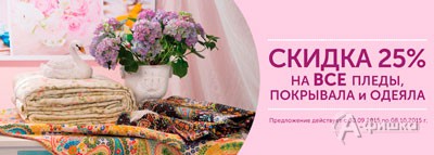 В гипермаркете домашних товаров «Уютерра» с 30 сентября по 8 октября 2015 г. скидка 25% на все пледы, покрывала и одеяла!