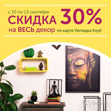 В гипермаркете домашних товаров «Уютерра» с 10 по 13 сентября 2015 г. скидка 30% на весь декор по карте «Уютерра Клуб»!