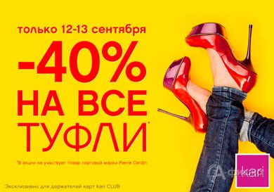 В магазинах обуви и аксессуаров «Kari» только 12 и 13 сентября 2015 г. специальное предложение – скидка 40% на все туфли!