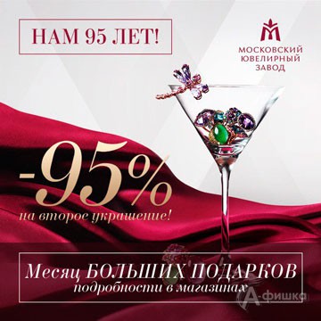 С 1 по 30 сентября 2015 г. в магазине «Московского ювелирного завода» проходит акция «Месяц больших подарков»! Большая скидка 95% на второе украшение из выделенного ассортимента и розыгрыш новых Айфонов 6S!