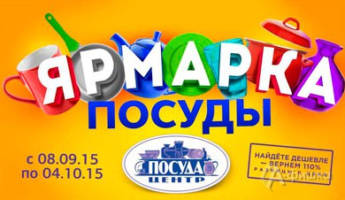В магазине товаров для дома «Посуда Центр» с 8 сентября по 4 октября 2015 г. проходит ярмарка посуды! На посуду для приготовления, столовую посуду и прочую кухонную утварь действуют самые выгодные цены!