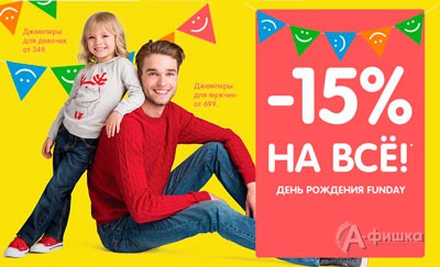 До 14 сентября 2015 г. в честь Дня рождения магазинов одежды «Funday» в России действует скидка 15% на всё!