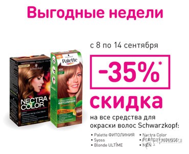 В сети магазинов «Магнит Косметик» проходит акция «Выгодные недели» – с 8 по 14 сентября 2015 г. скидка 35% на все средства для окраски волос «Schwarzkopf»!