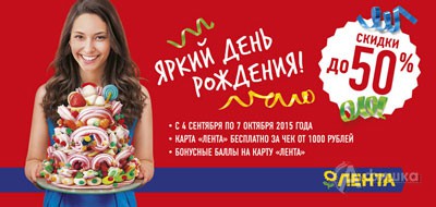 С 4 сентября по 7 октября 2015 г. в гипермаркетах «Лента» в Белгороде для владельцев карт постоянного покупателя «Лента» проходит акция «Яркий День рождения» – скидки до 50%, гарантированно 20 бонусных баллов + 1% от суммы покупок!