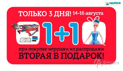 Только 3 дня, с 14 по 16 августа 2015 г. в детских магазинах «Кораблик» проходит акция «1+1»! При покупке игрушки из распродажи – вторая в подарок!
