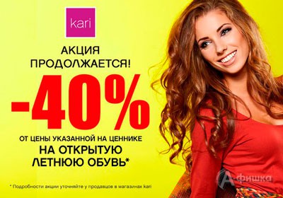 В магазинах обуви и аксессуаров «Kari» продолжается акция на открытую летнюю обувь – скидка 40% от цены, указанной на ценнике, на шлепанцы, сандалии, сабо, босоножки!