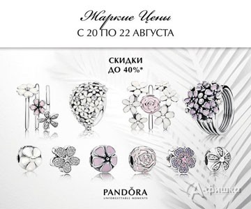 С 20 по 22 августа 2015 г. в ювелирных салонах «Pandora» проходит акция – жаркие скидки до 40% на украшения из летней коллекции!