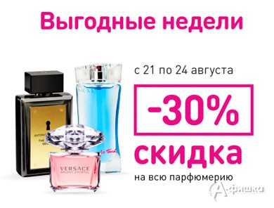 В сети магазинов «Магнит Косметик» проходит акция «Выгодные недели» – с 21 по 24 августа 2015 г. скидка 30% на всю парфюмерию!