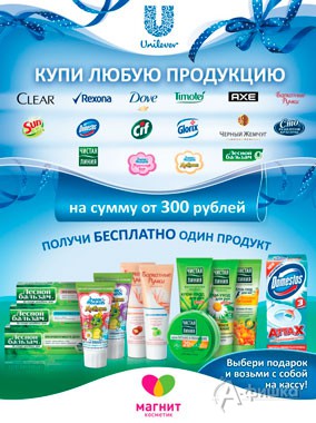 С 3 июня по 25 августа 2015 г. в сети магазинов «Магнит Косметик» проходит акция – купите продукцию «Юнилевер» на сумму от 300 руб. и получите гарантированный подарок на кассе!