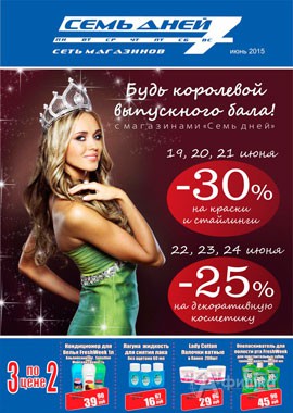 К предстоящим выпускным вечерам в сети магазинов парфюмерии, косметики и бытовой химии «7 дней» действует предложение: 19, 20 и 21 июня 2015 г. скидка 30% на краски и стайлинги; 22, 23 и 24 июня 2015 г. скидка 25% декоративную косметику!
