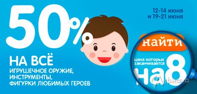 Только с 12 по 14 июня и с 19 по 21 июня 2015 г. в детских магазинах «Кораблик» на всё игрушечное оружие, игрушечные инструменты, фигурки любимых героев, цена которых заканчивается на 8, действует скидка 50% от цены на ценнике!