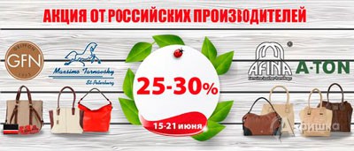 С 15 по 21 июня 2015 г. в магазине «1000 и одна сумка» в Белгороде проходит акция от российских производителей – скидка 25-30% на отечественные бренды!