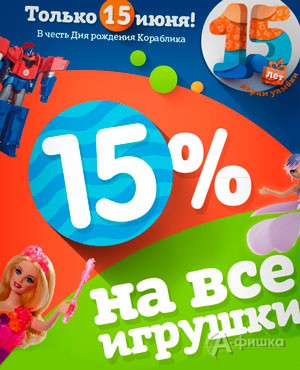 Только 15 июня 2015 г. в честь Дня рождения сети, в детских магазинах «Кораблик» на все игрушки действует скидка 15%!