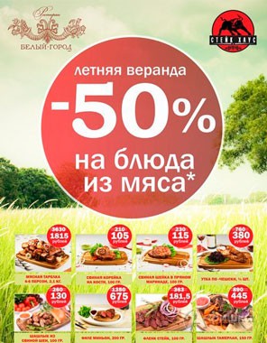 На летней веранде ресторана «Белый город» с 12 июня 2015 г. действует акция – на все блюда из мяса скидка 50%!