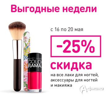 В сети магазинов «Магнит Косметик» проходит акция «Выгодные недели»! С 16 по 20 мая 2015 г. скидка 25% на все лаки для ногтей, аксессуары для ногтей и макияжа!